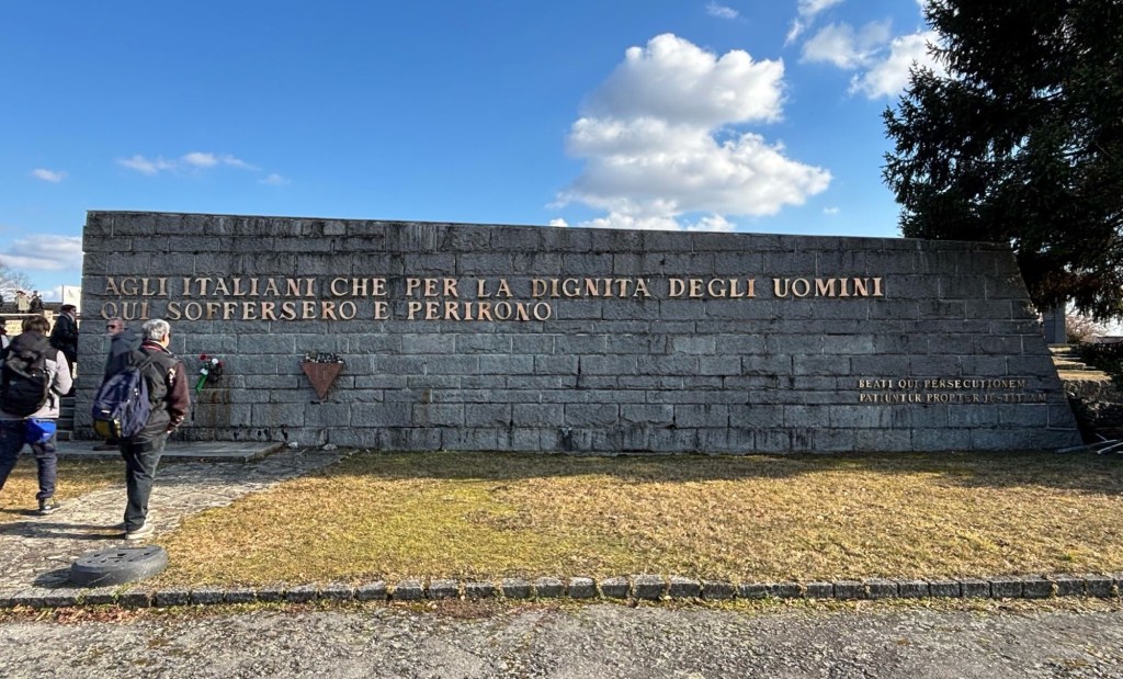 Infine ci siamo ritrovati con tutti i gruppi in viaggio per attraversare il campo fino ad arrivare al memoriale italiano dove abbiamo messo la corona di fiori e ascoltato i discorsi dei familiari degli ex deportati.